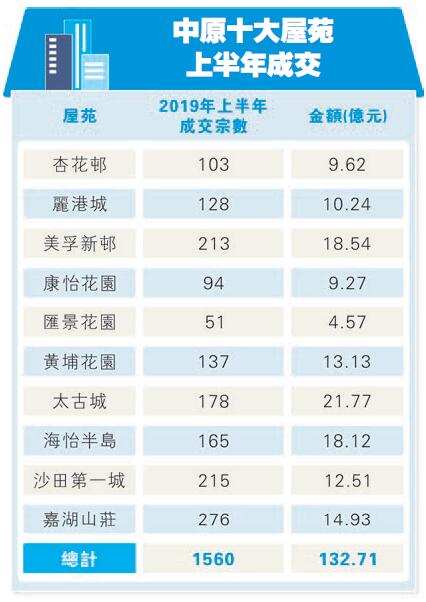 在十大屋苑中,2019年上半年嘉湖山莊錄得最多買賣登記,錄276宗,總值14.93億元。其次是沙田第一城,錄215宗,總值12.51億元。美孚新邨位列第三,錄213宗,總值18.54億元。