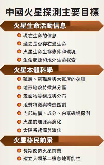 此外,有關火星的探測也將探討火星的長期改造與今後建立人類第二個棲息地的前景,其總目標是為人類社會的持續發展服務。「科學家擔心人類未來的命運,因為我們地球受到太多的自然威脅,再加上人類自身的一些行為,未來很可能把地球破壞得不能夠宜居了。所以我們一定要在太陽系裏面找一個對象,探討能否把它變成第二個地球,讓人類能夠大量的遷居到上面去。目前看,唯一可能的一個天體就是火星。」