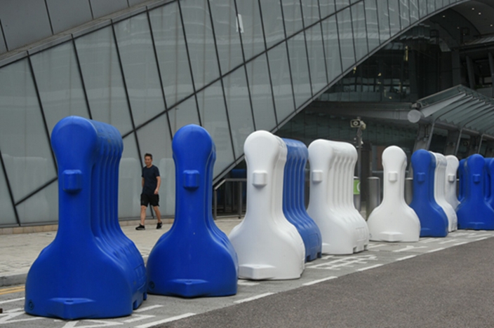 今日中午時分,西九龙站外的大型水馬開始陸逐搬走,乘客可經由A、D、K、M及N出入口進出香港西九龍站,但B出口(匯民道上落客區)及F出口(綠化空間)仍關閉: