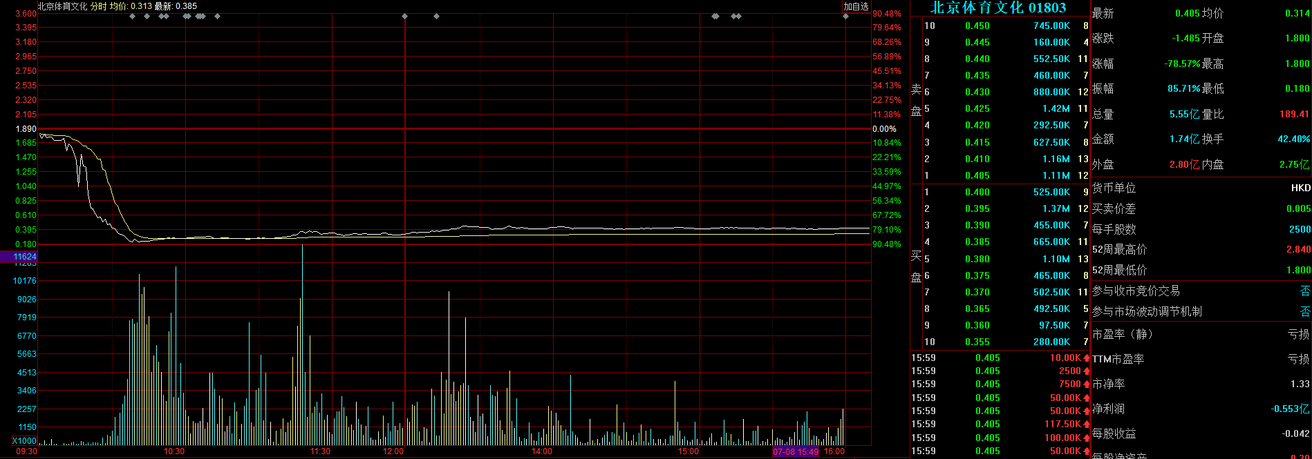 截至收盤,北京體育文化(1803.HK)跌幅略有收窄,下跌78.57%,報0.41港元/股,全天振幅達85.71%。