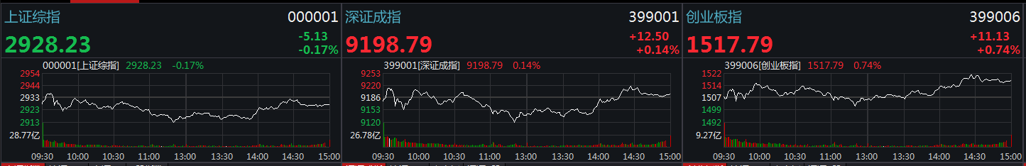 整體上看兩市量能萎縮,賺錢效應一般,個股漲跌互半。截止收盤,滬指報2928.37點,跌0.17%,深成指報9198.79點,漲0.14%;創指報1517.79點,漲0.74%。