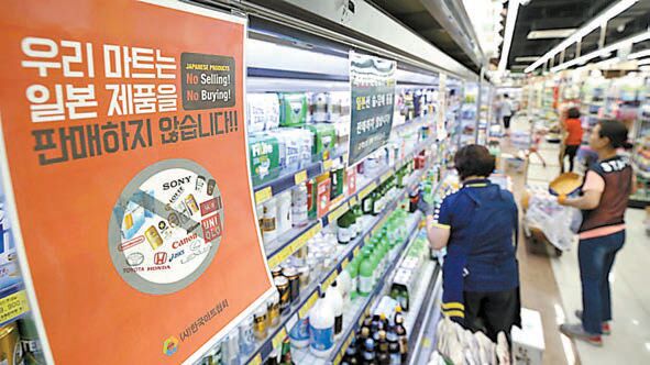 韓國的超市櫃架上貼有抵制日貨的標識。網絡圖片
