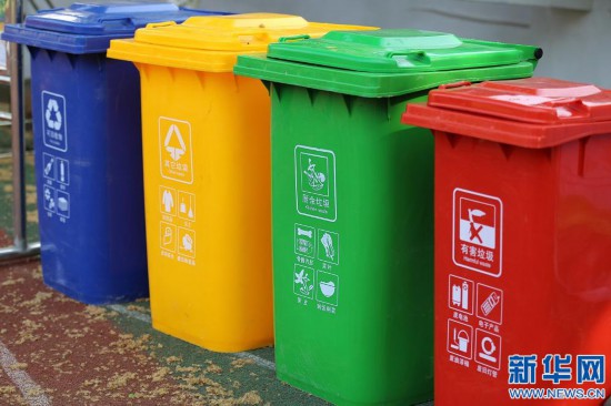 資料圖:四個顏色不同的垃圾箱,進行垃圾分類收集。新華網(楊益民 攝)