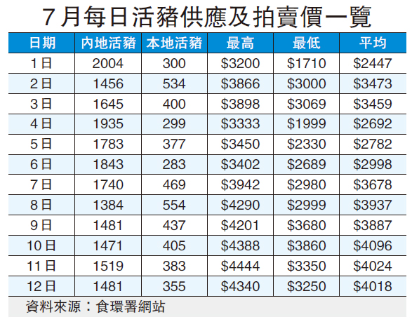 在傳出非洲豬瘟疫情前,內地供港活豬數目每日約有4000隻,惟近期已暴跌至2000隻以下。食環署資料顯示,在7月1日內地供港活豬數目僅2004隻,平均拍賣價達2447元,其後數天的供港活豬數目反覆,導致活豬價格波動。到7月8日,供港活豬數目跌至1384隻,平均拍賣價創下3937元的新高,翌日的平均拍賣價雖然微跌至3887元,惟其後數日的平均價仍維持在4000元以上的水平。據昨日最新資料顯示,內地供港活豬有1481隻,拍賣價(每擔)的最高價為4340元、最低價則為3250元,平均拍賣價高達4018元。預料今日內地供港活豬有2180隻、本地活豬則有100隻。