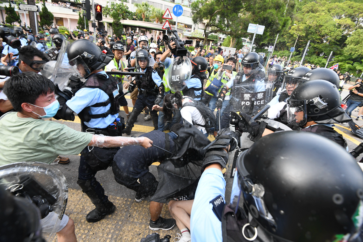 上水遊行後,一批示威者衝擊警方防線,其中一名戴上口罩、右臂纏保鮮紙的青年用雨遮插向警員。記者崔俊良攝