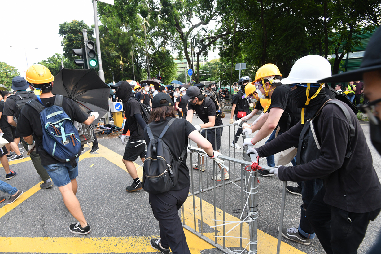 至下午5時遊行正式完結,部分示威者於上水廣場附近不斷搞事,初時在行人天橋與警方推撞,之後湧落街拆毀附近鐵欄,並以水馬鐵欄及其他雜物堵塞道路;期間明顯見到有站在高位的「個別人士」,部分為外籍,不斷向示威者打指揮手勢;不時有人以手推車運來一箱箱長傘,示威者急速拆箱拆袋組成人鏈向前方傳送;亦有人在新發街街頭擺起物資陣,向其他人派發。不少人即場戴上口罩、眼罩及頭盔等向警方防線衝擊。