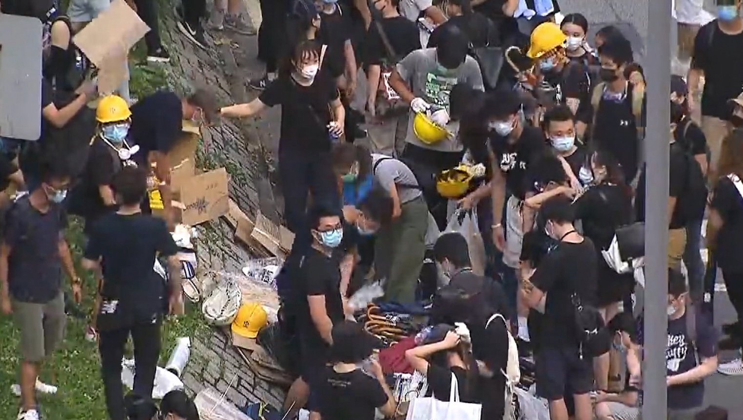 一批穿黑衣、戴口罩眼罩及頭盔的青年,在上水一帶馬路取走鐵馬,準備攔路。