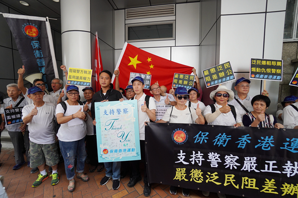保衛香港運動主席傅振中表示,反對暴徒使用暴力,譴責暴力事件,因此舉辦集會支持香港警隊克盡己職去維持社會秩序。在場人士大叫口號「支持警察嚴正執法,嚴懲泛民阻差辦公」、「阻礙警方執法,濫用議員權力」、「包庇暴徒犯法,泛民卑鄙無恥」、「泛民爆粗辱罵,煽動仇恨警察」、「支持警方拘捕濫權違法政棍」,並拉起橫額,又讚揚警方表現及慰問因執法而受傷的警員。