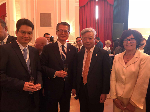 在盧森堡出席亞洲基礎設施投資銀行歡迎酒會,陳茂波(左二)跟亞投行行長金立群(右二)碰面交談。