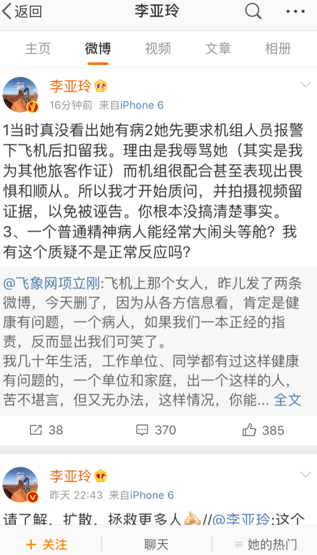 但从具体沟通协调情况看,精神疾病的说法应该是国航的口径。就在刚刚,李亚玲在微博中发布评论称:“1当时真没看出她有病2她先要求机组人员报警下飞机后扣留我。理由是我辱骂她(其实是我为其他旅客作证)而机组很配合甚至表现出畏惧和顺从。所以我才开始质问,并拍摄视频留证据,以免被诬告。你根本没搞清楚事实。3、一个普通精神病人能经常大闹头等舱?我有这个质疑不是正常反应吗?”