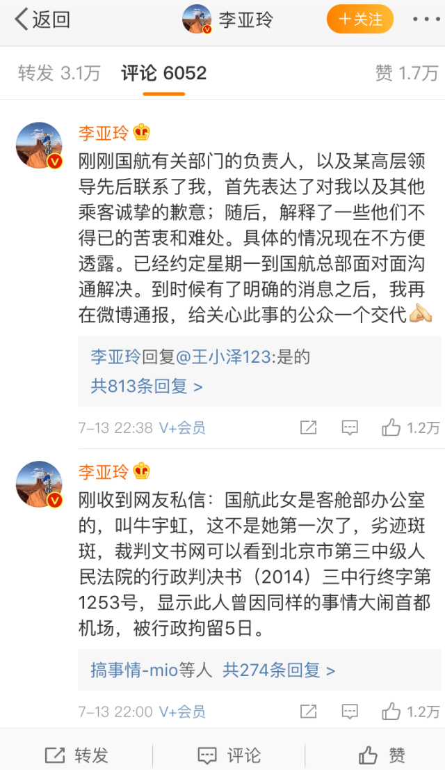 李亚玲13日发布的微博称:“刚收到网友私信:国航此女是客舱部办公室的,叫牛宇虹,这不是她第一次了,劣迹斑斑,裁判文书网可以看到北京市第三中级人民法院的行政判决书(2014)三中行终字第1253号,显示此人曾因同样的事情大闹首都机场,被行政拘留5日。”