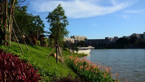 在岸線處理方面,遊人能接觸的河岸範圍採用淺水區設置,並種植水生植物創造水下森林。在南、北湖通過築島形成豐富的景觀空間,形成豐富的濕地溪流效果。在城市配套設施方面,增設指引牌、警示牌、公園座椅、垃圾桶等,提升服務品質。