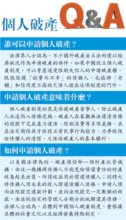有法律專家認為,儘管內地《企業破產法》已實行十幾年,但隻能稱為「半部破產法」,因為其隻對企業的破產進行了規定,而沒有對個人破產進行相應的規范。所謂個人破產制度,指的是個人資產無法清償其債務時,通過一定的法律程序宣布其破產並核銷債務的制度。目的是對破產申請人的財產進行清算和分配或者進行債務調整,對確實無能力進行清償的債務進行豁免,並確定破產申請人在破產過程中的權利義務關係。
