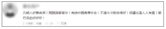 “元朗人很善良的!问路都会回答你!有时候还亲自给你带路!不过这次做得好!保护社区人人有责!都没有流血很好啊!”