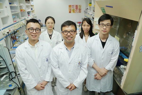 科大理學院生命科學部助理教授郭玉松(前中)及其研究團隊,包括是次科學期刊文章的第一共同作者馬天驥(前左),發現了一種酶的新功能。