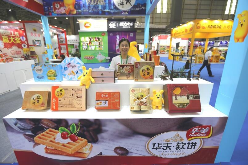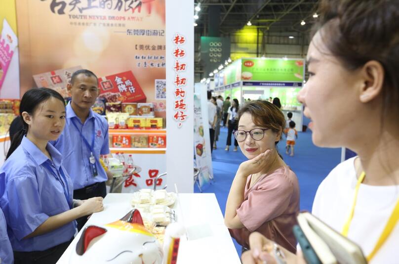展會現場,300多家參展廠商展出了上千款年度新品,展商現場邀請觀眾免費試吃品嘗,拓品牌、建渠道、覓商機,可謂「八仙過海各顯神通」,各種珍饈美味亦是讓食客開胃飽餐。製作瑪仔(粵語稱沙琪瑪為瑪仔)超過30年的東莞同發食品展出了多款大小不一、口感不同的瑪仔、蛋卷,觀眾現場試吃過後還要打包帶走。同發食品創始人陳錦祺介紹,瑪仔是傳統小吃,舊時因物資短缺,僅在逢年過節才有的吃;如今的瑪仔經過工序、材料等創新改良,除了傳統的金黃色,還有紅糖、巴旦木、南瓜仁、蔓越莓等多種口味,口感更細膩,不粘齒,不粘喉,喉清氣爽。該公司展會現場除了傳統瑪仔,還有牛軋瑪仔、雪花奶芙太等創新產品,冀望借展會結交更多美食愛好者。