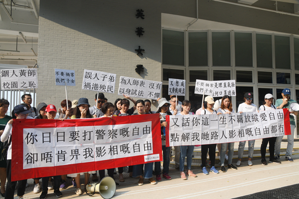 另外,民間團體「同心護港」約10人,昨早到薄扶林嘉諾撒聖心書院,抗議該校通識科教師賴得鐘發表仇警辱警言論,為學生帶來不良影響的惡劣行為。「同心護港」召集人曹達明表示,賴得鐘早前在網上發表辱罵與詛咒警察相關言論,傳播仇恨主義,為教育學生帶來負面影響,希望學校辭退涉事教師。他說,為人師表卻傳播不當言論,或可能在執教時誤導學生,希望香港所有學校和教師引以為戒。