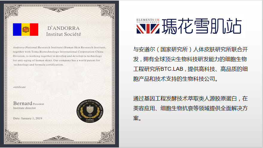 法國安道爾國家研究院發出瑪花雪肌站對人體的優質量及高技術證明。