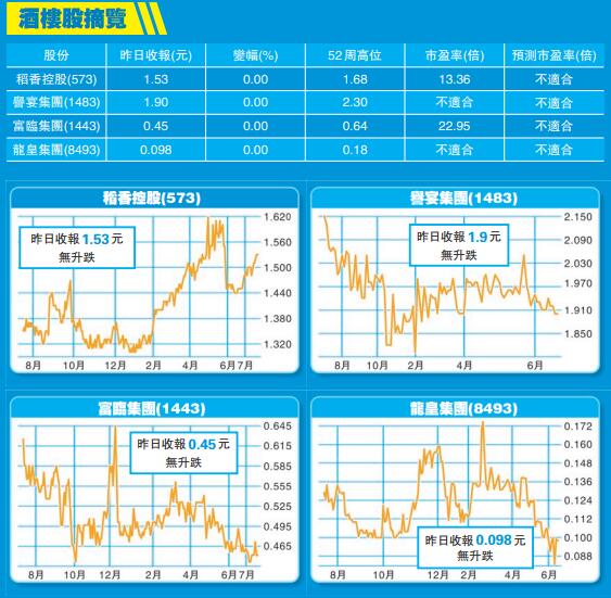 今次集中看看本地酒樓經營狀況,眾多隻酒樓股中,如富臨集團及龍皇集團去年業績均現倒退,只有稻香控股去年業績尚可,惟該股技術走勢平平。