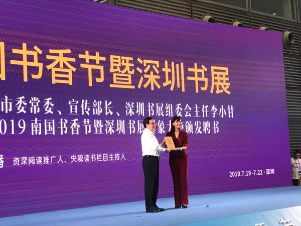 隨後,深圳市委常委、宣傳部長、深圳書展組委會主任李小甘為深圳書展形象大使李潘頒發聘書,李潘是央視科教頻道《讀書》欄目主持人,她表示:“我特別喜歡深圳的一個閱讀理念就是讓城市的每扇窗戶都能夠透出閱讀的燈光,所以我是願意做這樣一個點燈人,能夠讓閱讀溫暖更多的人,給更多的人帶去力量,同時我 也希望讓城市的閱讀之光長明。”