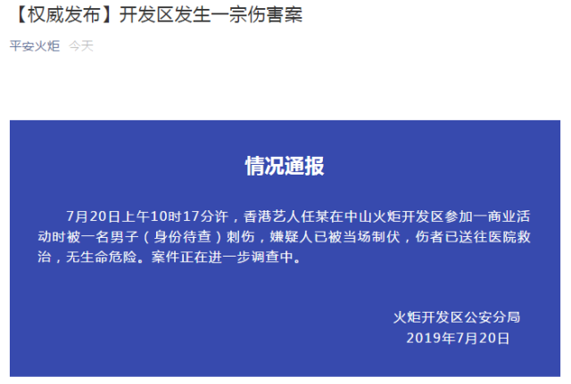 中山火炬開發區公安分局表示,今日早上10時許,任達華參加一項商業活動時,被一名男子用刀刺傷,嫌疑人當場被制服,身份有待調查,任達華送往醫院救治,目前沒有生命危險,案件正進一步調查。