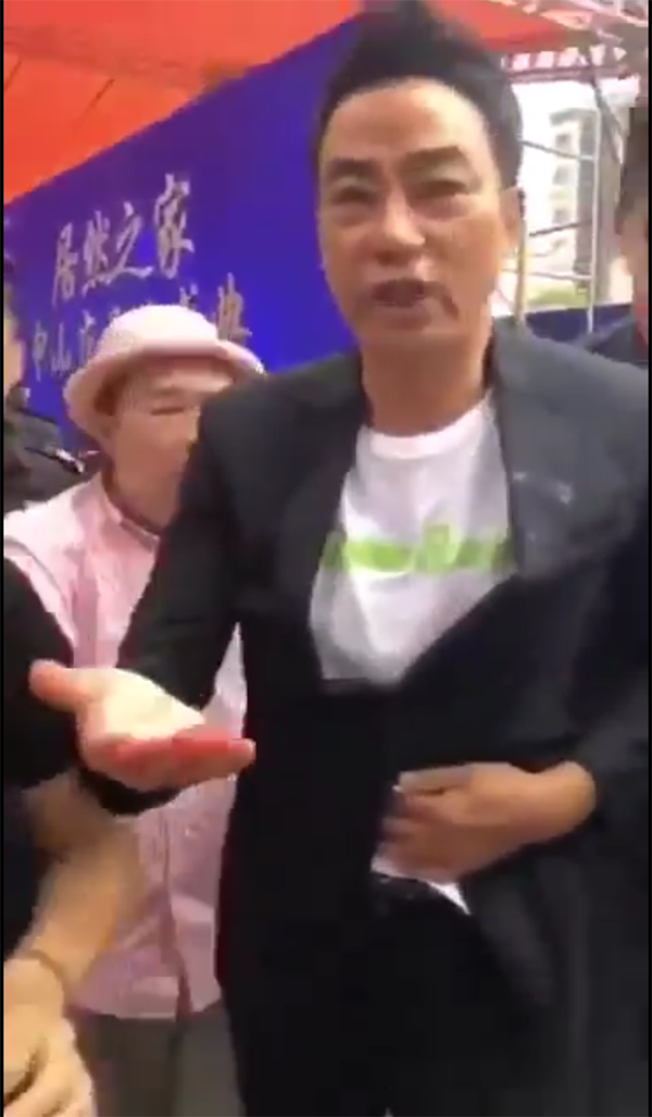 任達華在中山出席活動時在台上遇襲,他被一名男子用利刀刺傷,導致腹部及手指受創。(網上視頻截圖)