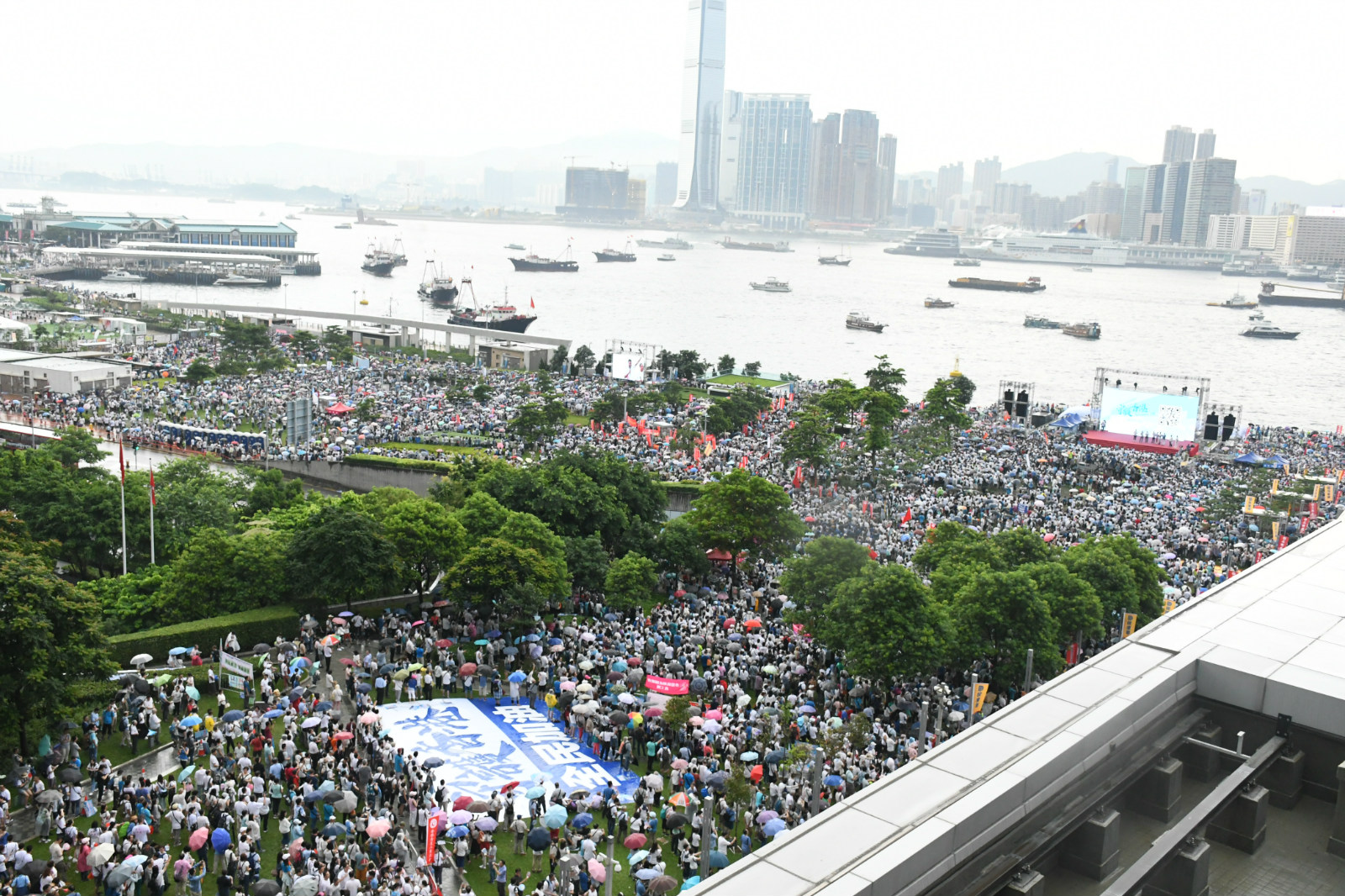 巡遊船隊於下午5時正駛至維港近添馬公園大臺的位置,與於添馬公園參與守護香港集會的市民互相呼應。