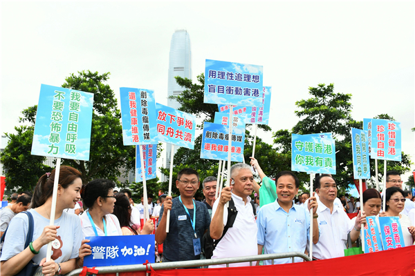 香港各界人士發起的「守護香港」集會,獲大批市民響應出席支持。有參加集會市民表示,回歸後香港的自由民主已大大增加,示威者卻繼續無理取鬧,主要「服務市民」的香港警察被暴力對待,實在十分可悲;有市民說「香港是我家,不要暴徒破壞它」。