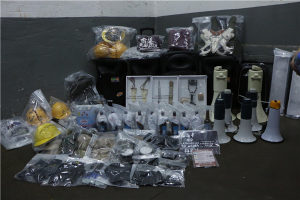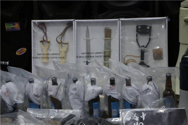 另外,警方又在現場發現一批攻擊性武器,包括鏹水、彈叉、利刀及鐵棍等。行動中,一名27歲男子當場被捕,涉嫌無牌管有爆炸品,行動仍在進行中,不排除有更多人被捕。