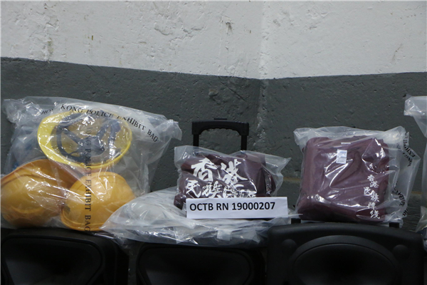 警方檢獲的頭盔及印有「香港民族陣綫」的衣服。