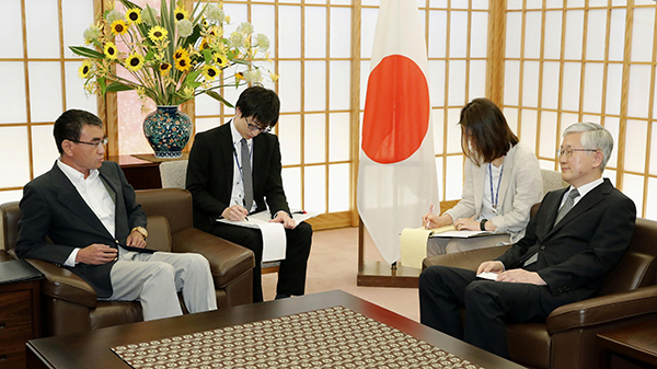 日本外相河野太郎19日(左)召見韓國駐日大使南官杓。路透社