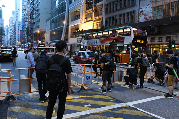 傍晚6:30左右,一批數以百計身穿黑衣、戴上口罩手套的、配備頭盔的示威者在中環聚集,並沿干諾道中向上環方向前進。有示威者抵達西環干諾道西近西港城后,繼續向西推進。示他们搜掠路旁的膠圍欄、鐵馬、雪糕筒、路牌架以設路障。