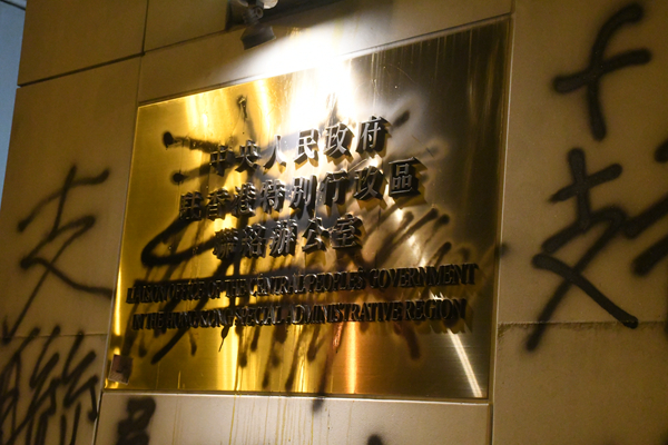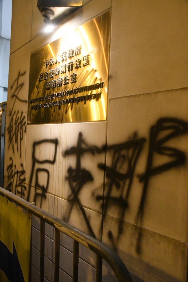 晚上7时许,逾千名示威者聚集在中聯辦門口,現場有人叫囂,有人張貼標語,手持雨傘敲打鐵閘,涂黑閉路電視,以及向內投擲雜物。还有示威者喷黑中联办的牌匾,在墙上写含侮辱的字眼,以及用污水及喷漆涂污中联办外的国徽及门牌。數名保安戴上頭盔並在玻璃門前落鐵閘,而鄰近的西區警署亦落閘。