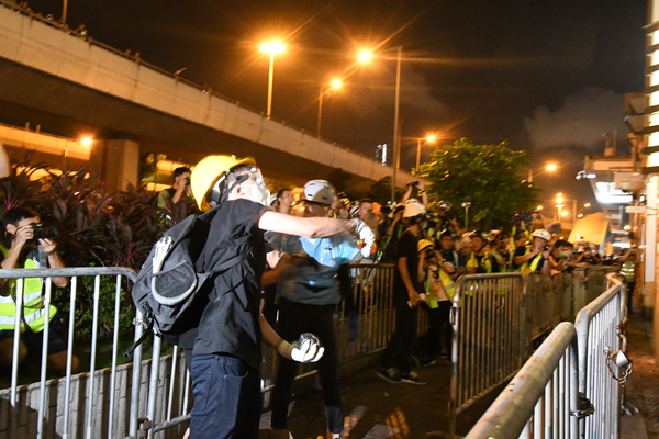 晚上10时许,警方於信德中心對開釋放多枚催淚煙驅散示威者,並出動速龍小隊清場。有示威者一度試圖以鐵馬開路衝擊警方防線,並投擲磚頭、鐵枝等雜物。