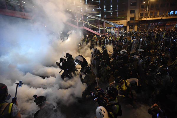 警察施放催淚彈驅趕暴力衝擊及堵塞馬路的示威者。