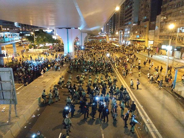 警方與示威者繼續僵持,示威者繼續向警方投擲附近地盤搜掠的竹枝,警方用警棍敲打盾牌嘗試威嚇示威者,但示威者繼續投擲硬物。現場有立法會議員楊岳橋、許智峯要求與警方指揮官對話,容許示威者離開,但警方指揮官指責已經給予個多小時要求離開,但示威者不但無離開更加投擲硬物襲擊警察,警察所以進行自衛。