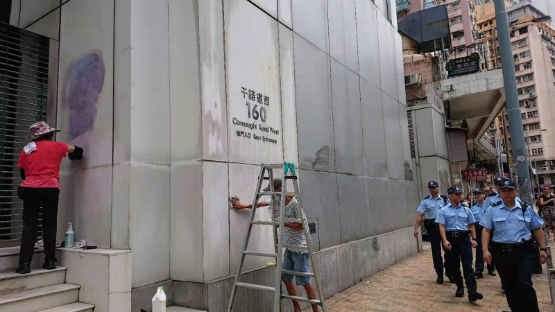 部份反修例示威者昨日(21日)遊行後包圍中聯辦,向大樓及國徽擲雞蛋及潑漆,並噴上字句。被塗污的國徽已經於昨晚更換完畢,外牆的字句就用膠布遮蓋。清潔人員今早在場繼續清理,中聯辦外早上氣氛平靜,職員如常上班。