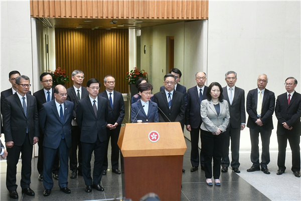 【香港商報網訊】行政長官林鄭月娥今日(22日)下午三時聯同一眾司局長及警務處長盧偉聰,在特首辦見記者。林鄭月娥強烈譴責昨日遊行後,部分激進示威者惡意包圍及衝擊中聯辦大樓,汙損國徽,挑戰國家主權、觸碰「一國兩制」的底線,傷害民族感情,令全城憤慨。林鄭月娥強調,政府必然會嚴肅跟進,依法追究。