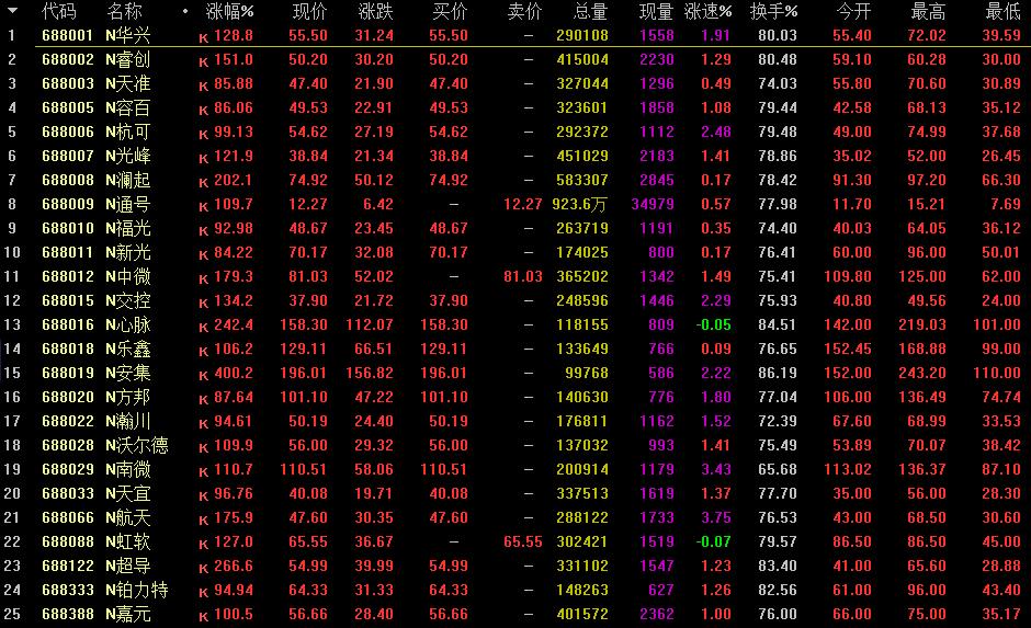 7月22日消息,科创板首批25家上市公司在上交所正式亮相。截至收盘,首批25只科创板股票首日平均涨幅约140%,其中安集科技(196.010, 156.82, 400.15%)涨幅居首,大涨400%。但科创板个股中也有近半数K线翻绿。