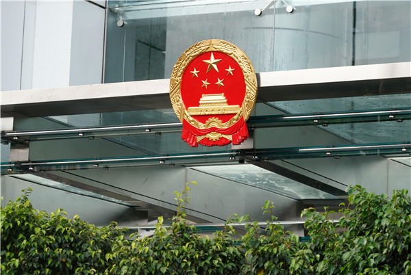 中聯辦大樓懸掛起嶄新的國徽。 中通社