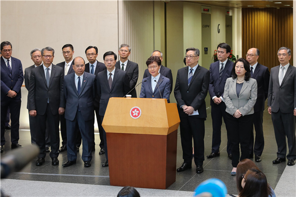 林鄭月娥昨午率領一眾司長、局長會見記者。她表示,前天的遊行之後,西區、中上環一帶有一連串的暴力行為,「特區政府在此必須強烈譴責部分激進示威者惡意包圍、衝擊中聯辦大樓,而且污損國徽,公然挑戰國家的主權,觸碰『一國兩制』的底線,而且傷害民族感情,令全城憤慨。特區政府必定會嚴肅跟進,依法追究。」