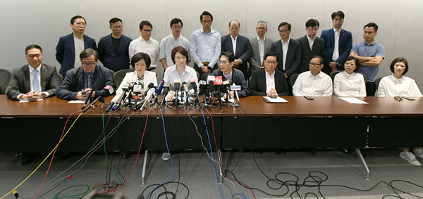 建制派議員舉行記者會回應21日晚有示威者圍堵中聯辦,塗污國徽及元朗發生的傷人案。建制派議員發表聯合聲明指,21日反修例遊行結束後,有示威者惡意包圍警察總部,令警隊無法正常運作及執勤,又向中聯辦集結,聯群結隊圍堵衝擊中聯辦,飛擲黑色顏料塗污國徽,投擲雞蛋和雜物,又肆意破壞設施,企圖強行攻人大樓。