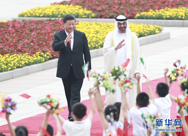 7月22日,國家主席習近平在北京人民大會堂同阿聯酋阿布扎比王儲穆罕默德舉行會談。這是會談前,習近平在人民大會堂東門外廣場為穆罕默德舉行歡迎儀式。 新華社記者龐興雷攝