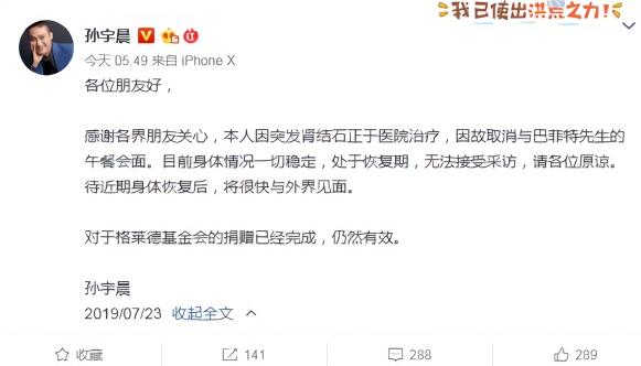 對於取消的原因,孫宇晨則表示,自己因突發腎結石正於醫院治療,目前身體情況一切穩定,處於恢複期,無法接受采訪,請各位原諒。