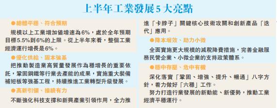 中國工信部副部長辛國斌昨日表示,上半年主要工業運行指標表現平穩,好於預期。今年工業增長保持在5.5%到6%是可以接受的一個指標。不過,工信部同時指出,下半年,影響工業經濟運行的有利因素和困難風險交織並存,回升動力和下行壓力並存,不確定不穩定因素依然較多