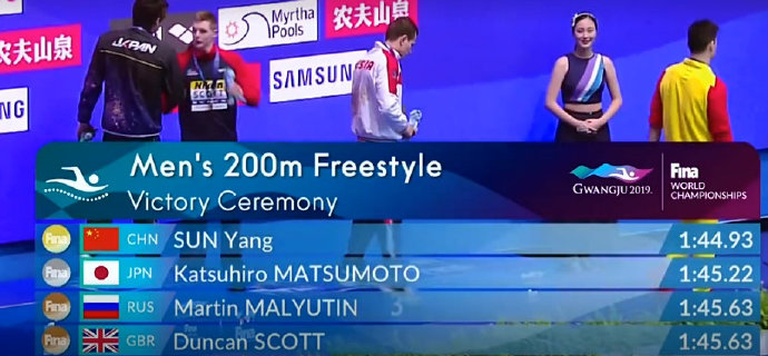 男子200米自由泳決賽前三頒獎,冠軍大白楊在中間,第三名有兩位。第四名的英國選手斯科特·鄧肯未上台,拒絕與孫楊頒獎合影,在孫楊走下頒獎台後,才走上台與第二名握手。
