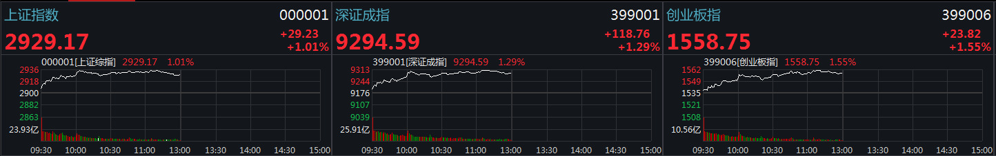 截止午盤收盤,滬指報2929.17點,漲1.01%,深成指報9294.59點,漲1.29%,創指報1558.75點,漲1.55%。