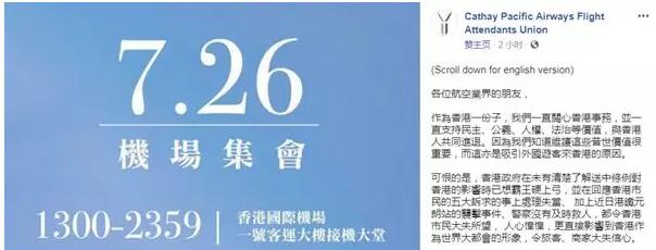 香港近期發生的激進暴力事件正受到越來越多愛港人士的譴責,但在昨天,一個名為“國泰航空空中服務員工會(CPAFAU)”的組織卻在社交媒體上公然呼籲航空業者於7月26日在香港國際機場集會,並對香港政府提出諸多要求。這種可能危害航空秩序的做法在香港引起一些批評,而國泰航空工作人員24日對環球時報-環球網記者回應稱,該工會組織的立場與國泰航空無關。