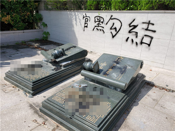 現場被毀的墓碑仍放置在地上,牆上被人用黑色噴漆寫上的「官黑勾結」、地上的大字及墳頭上的粗口,都未見有人前往清理,或有工人進行維修。