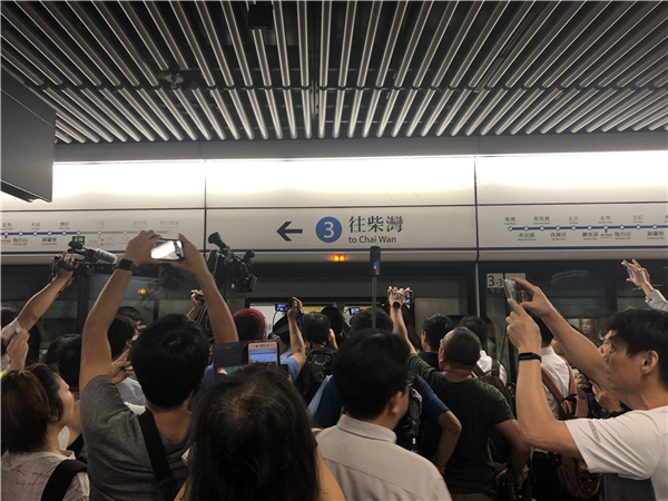多名黑衣人士在金鐘站故意阻礙列車車門關上。記者馮煒強攝